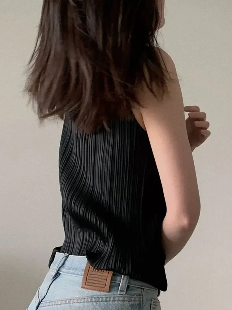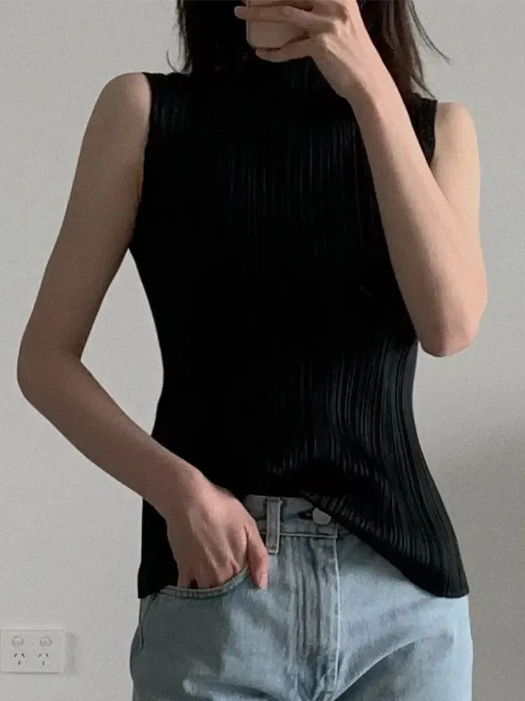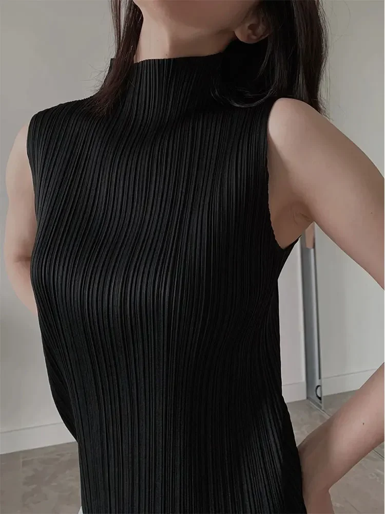 Miyake Pleated Elegant Fashion Temperament Solid Color Half High Neck Sleeveless Women's Vest 2023 Summer New Breathable Top