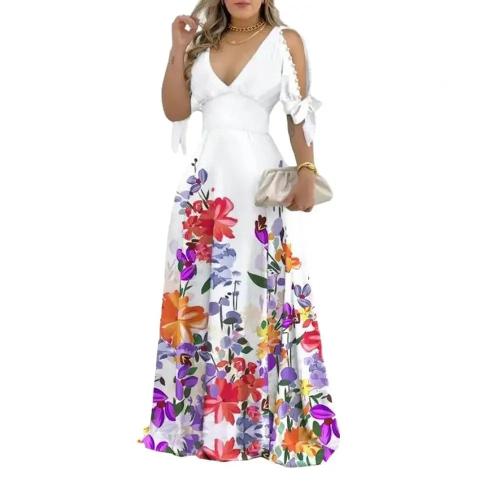 2024 Summer Elegant Women Sexy V Neck Bohemian Long Dress Floral Print Party Dress Tie-up Short Sleeve Hollow Maxi Dresses