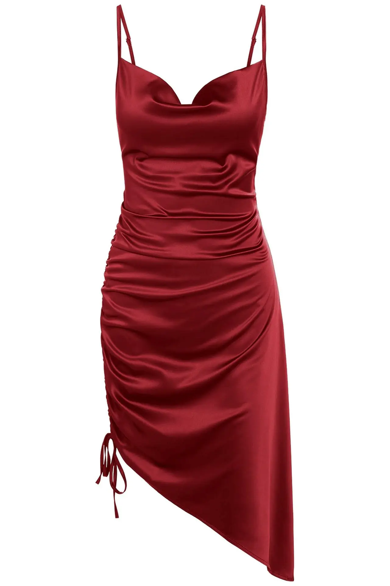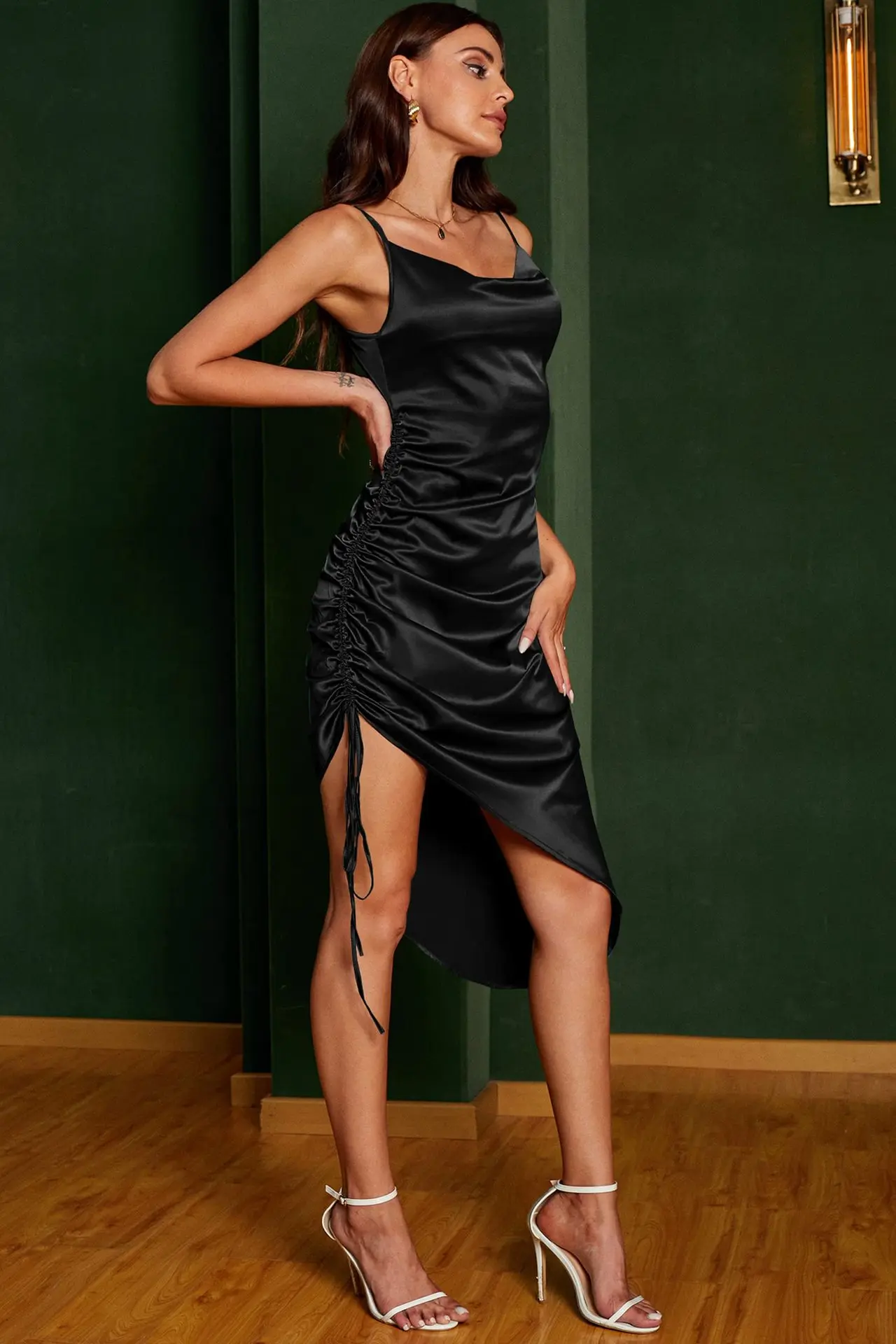 2024 Summer Women Satin Backless Sexy Black Dress Female Vestidos Elegant Solid Drawstring Irregular Party Midi Dresses