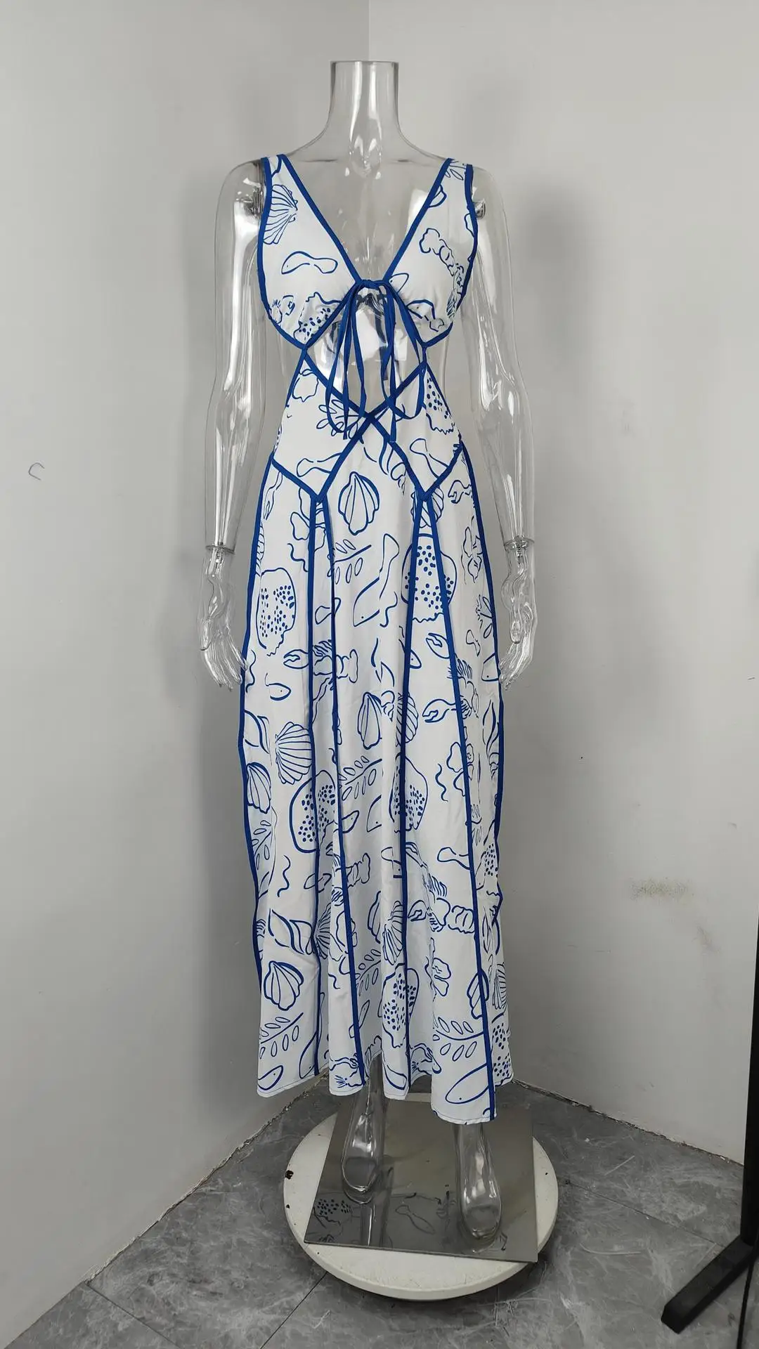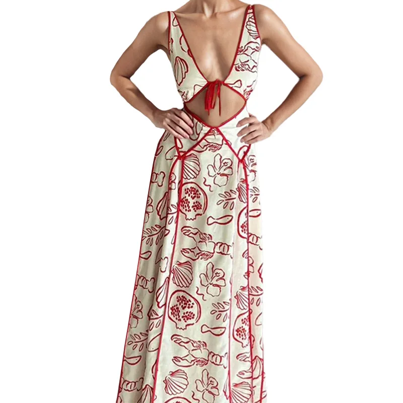 2025 New Summer Elegant Women Printed Maxi Dress Fashion Sexy Backless V-Neck Bandage Tank Dress Lady Party Sleeveless Vestidos