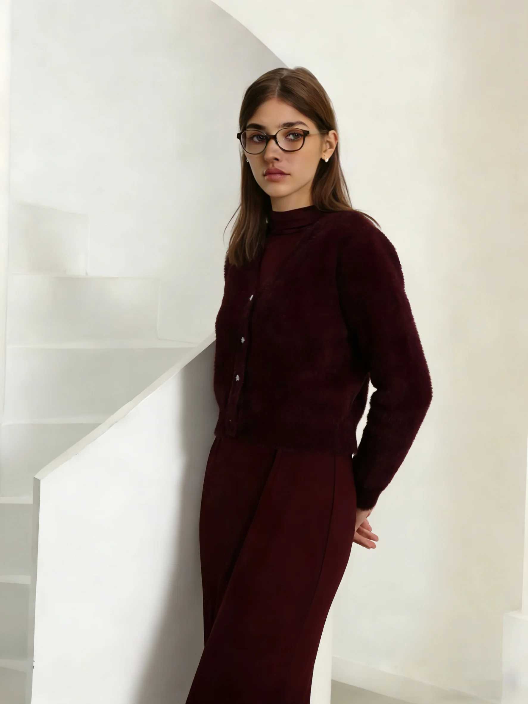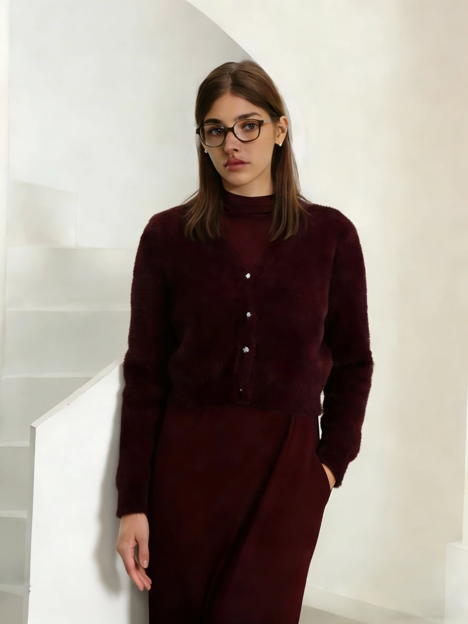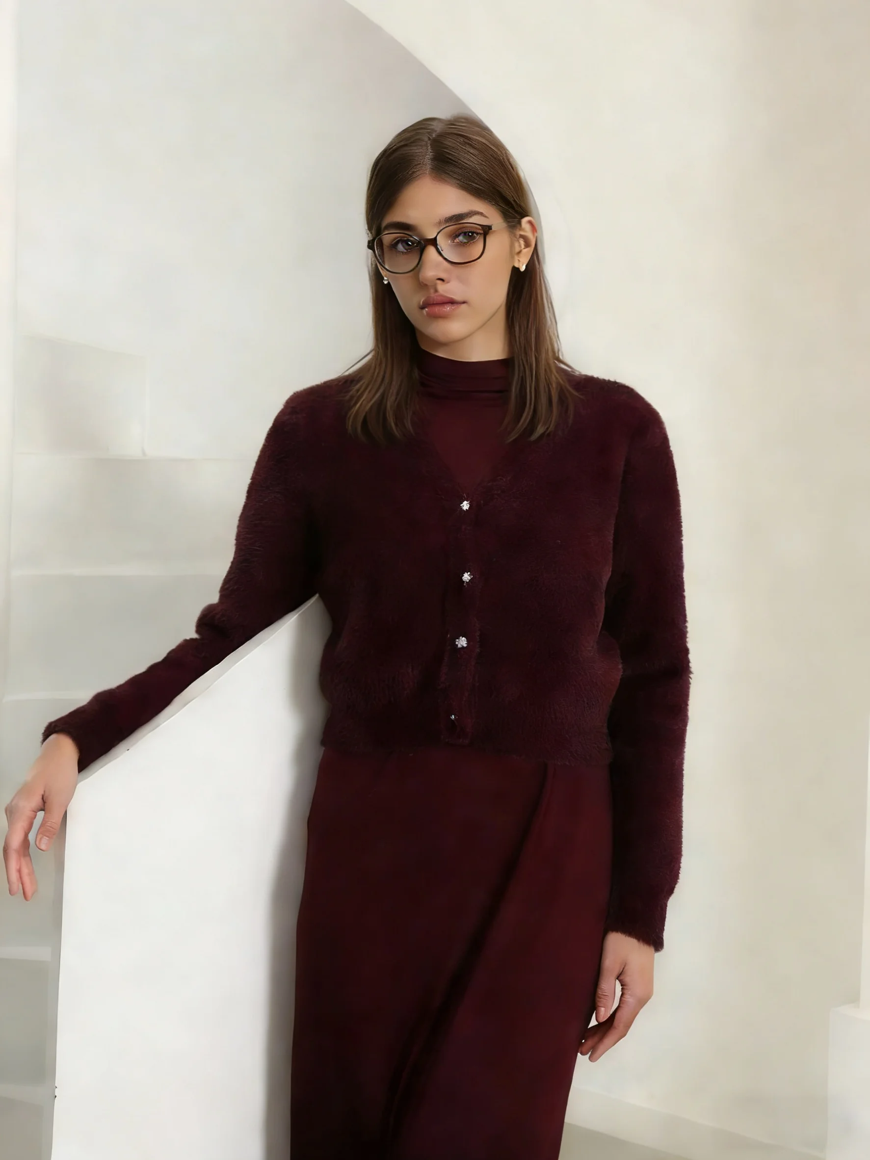 2026 Autumn Winter Women Wine Red Thick Warm Coat Long Sleeve V-neck Soft Fleece Jacket Precious Bright diamond button Warm Wear