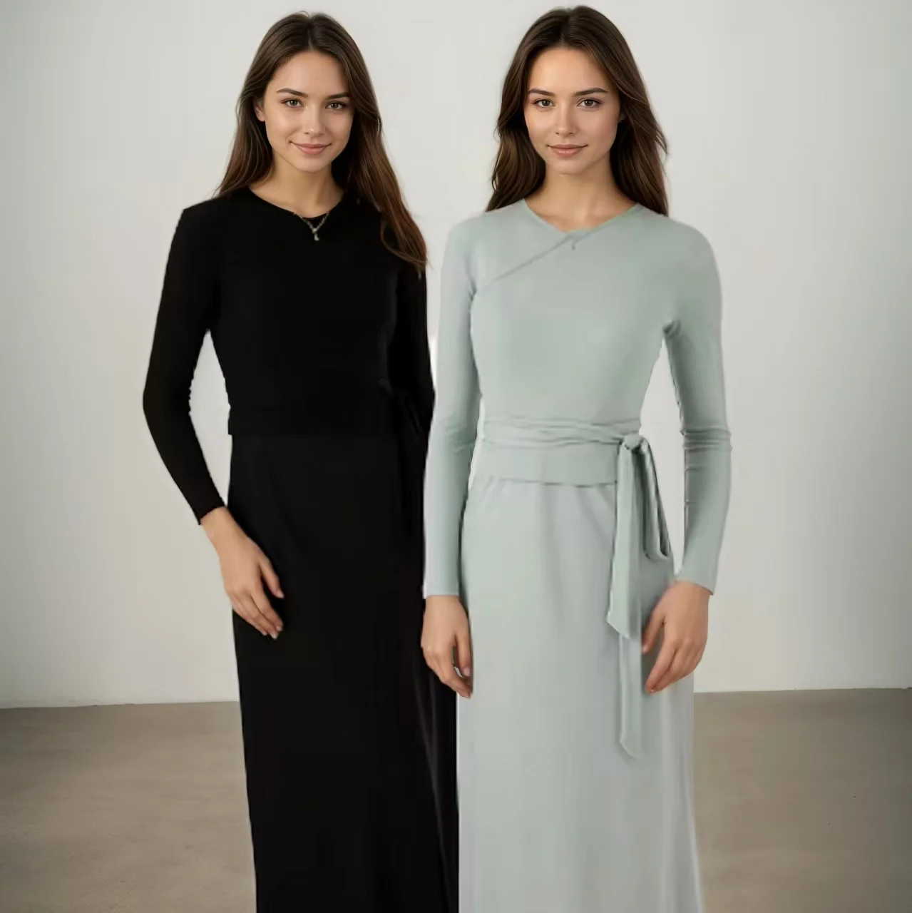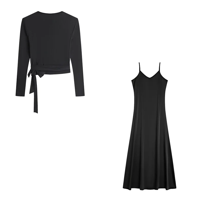 New Autumn Woman Long Sleeve Dress Suit Solid Color Tie With Bow Top And Milk Silk knit Suspenders Dress Elegant Female Outwear