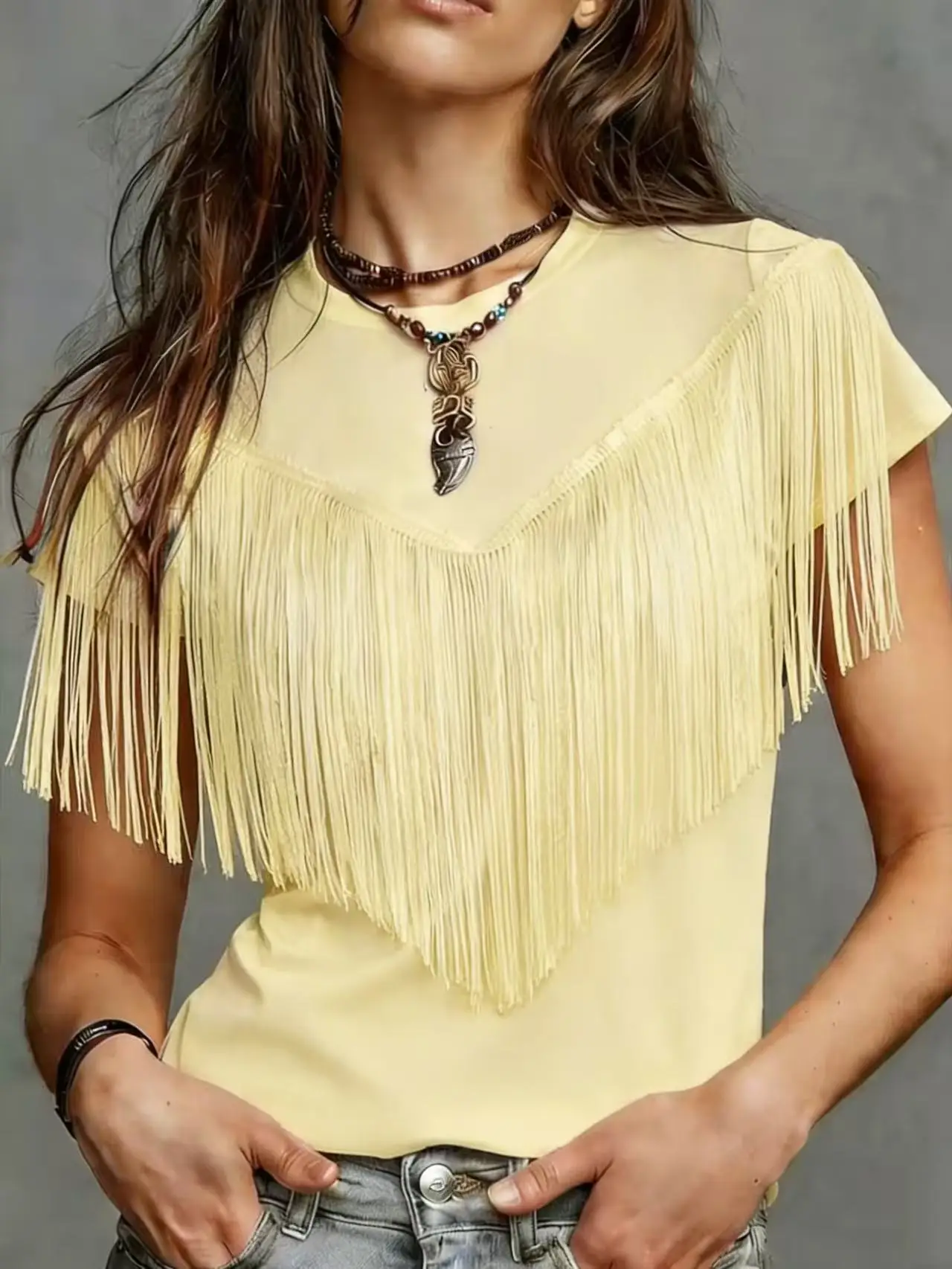 New Women's round Neck Solid Color Tassel Design Short Sleeve T-Shirt Fashionable Ladies' Top