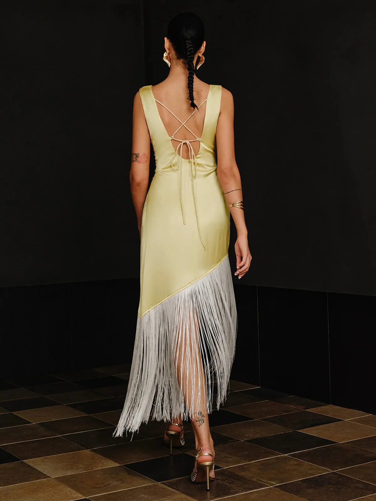 Spring Summer Fashion Elegant Women Temperament Long Dress Tassel Patchwork Backless Long Dress Off Shoulder Satin Party Dress