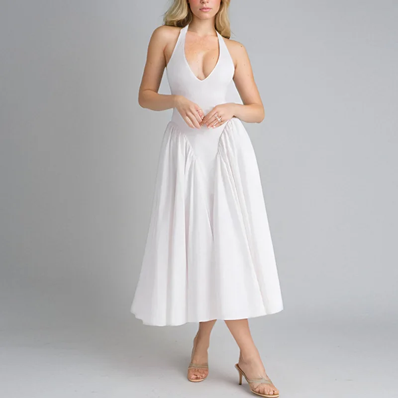 Summer French Style Women Party Dress Socialite Deep V Neck Long Dress Sexy Halter Gathered Waist Slim Fit Solid color Gown