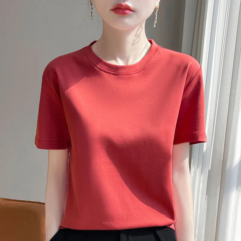 Summer Round Neck Cotton Short-Sleeved Women's T-Shirt Loose Pure Casual Top Mercerized Cotton Bottoming Shirt