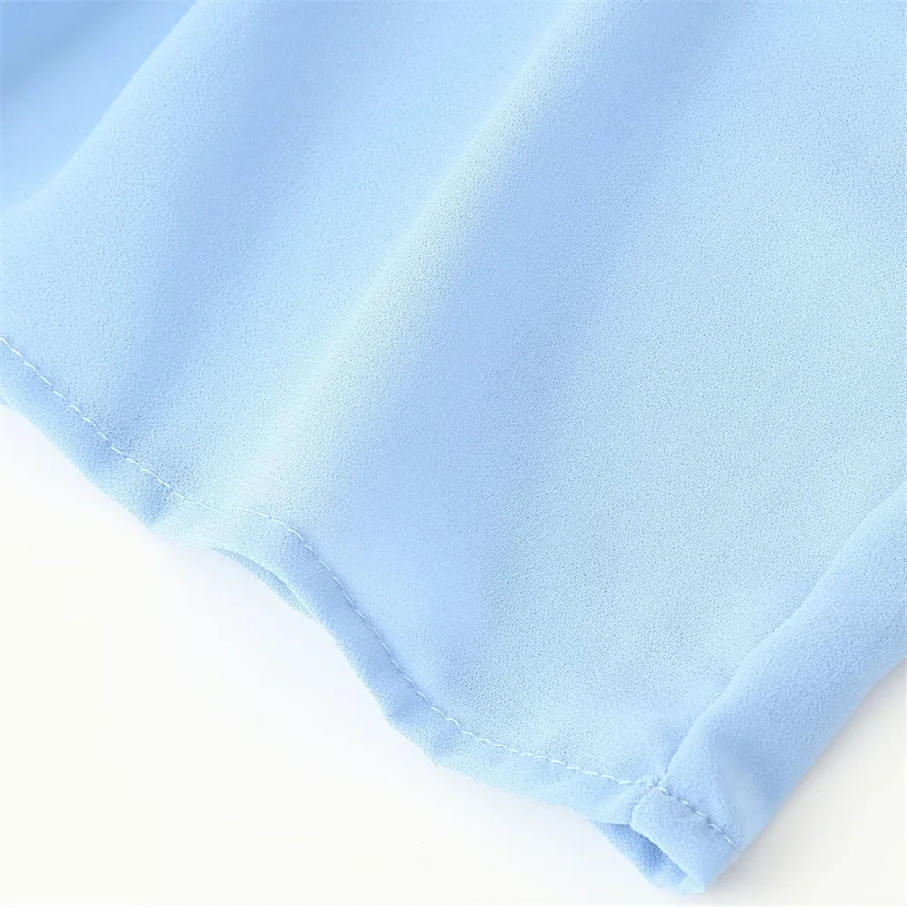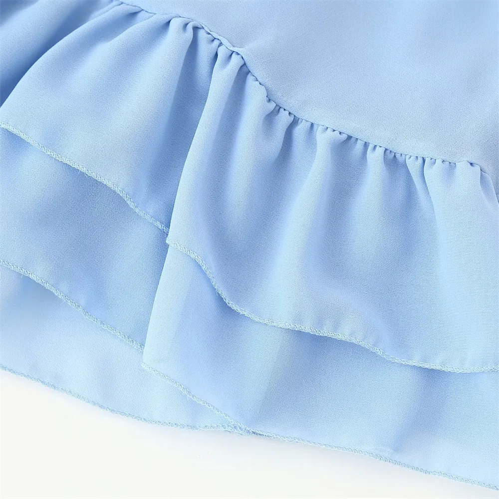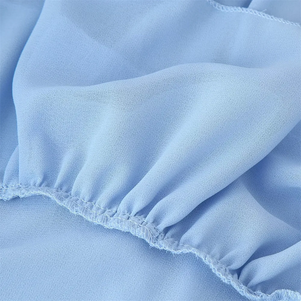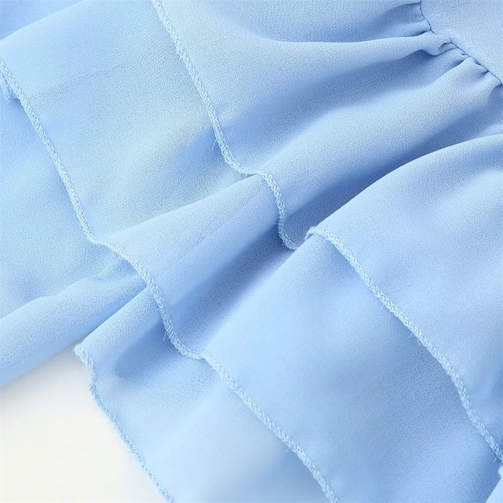 VEITCHE Fashion Women Chiffon Ruffles Mini Dresses Loose Turtleneck Flare Sleeve Blue Dress Spring Summer Lady Vacation Robes