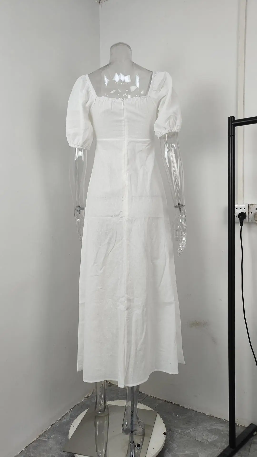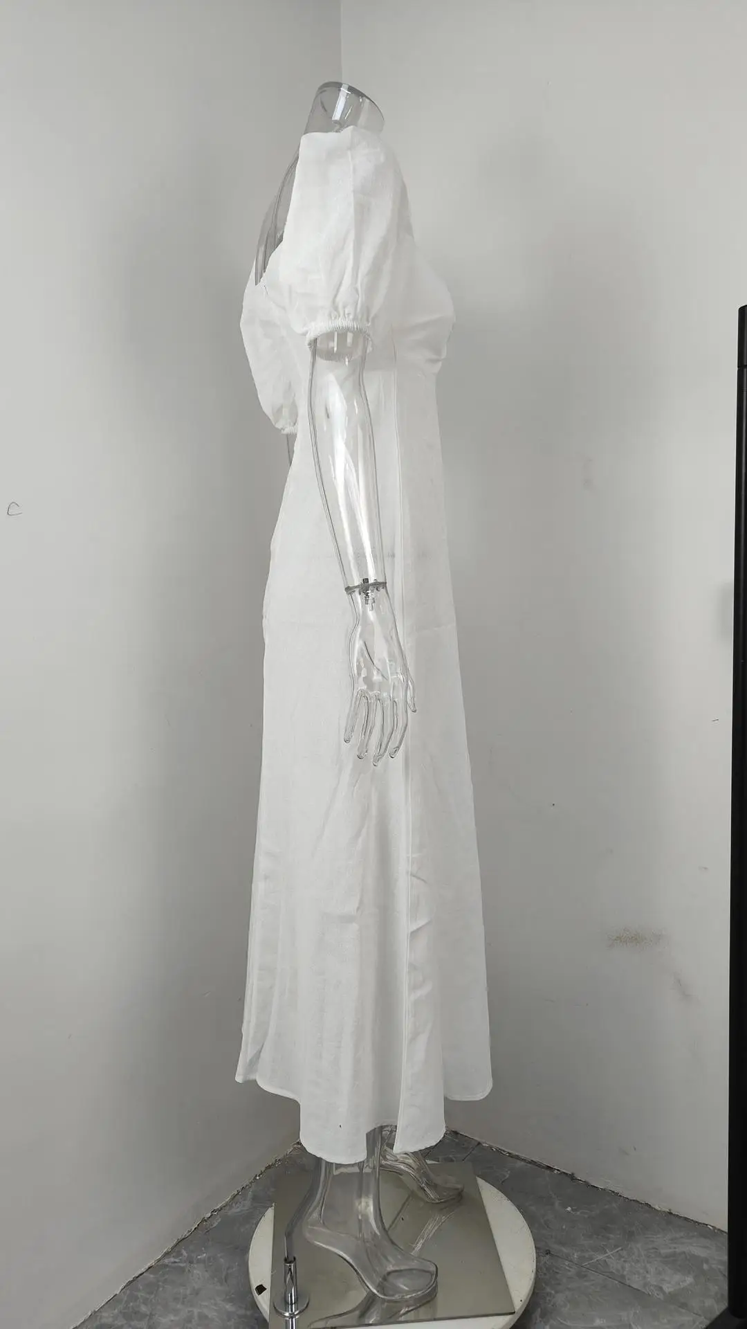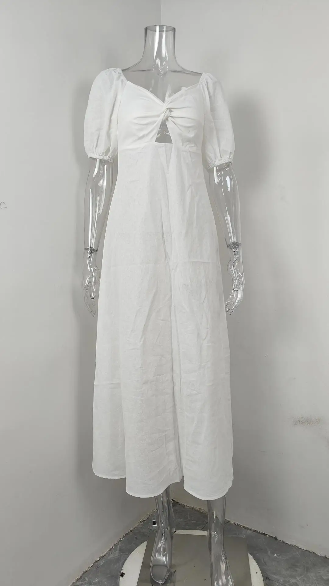 VEITCHE Summer Fashion Womens White Long Dresses Elegant Short Sleeve V-Neck Hollow Out Dresses High Waisted Casual Dress