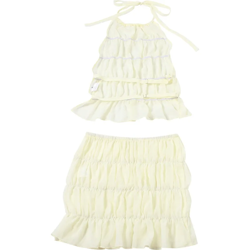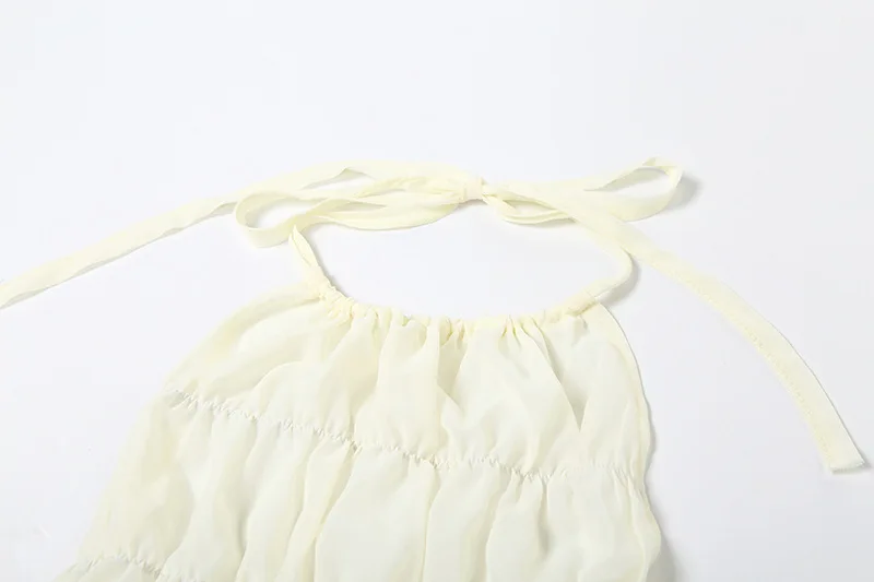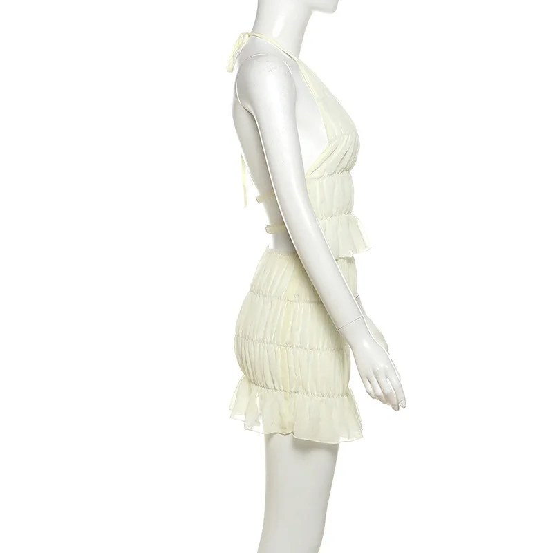 VEITCHE Women Backless Chiffon Mini Skirt Set Sexy Hanging Neck Pleated Solid Color 2025 Summer Beach Vacation Short Skirt Suit