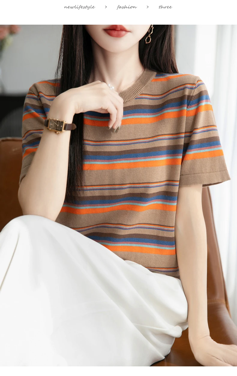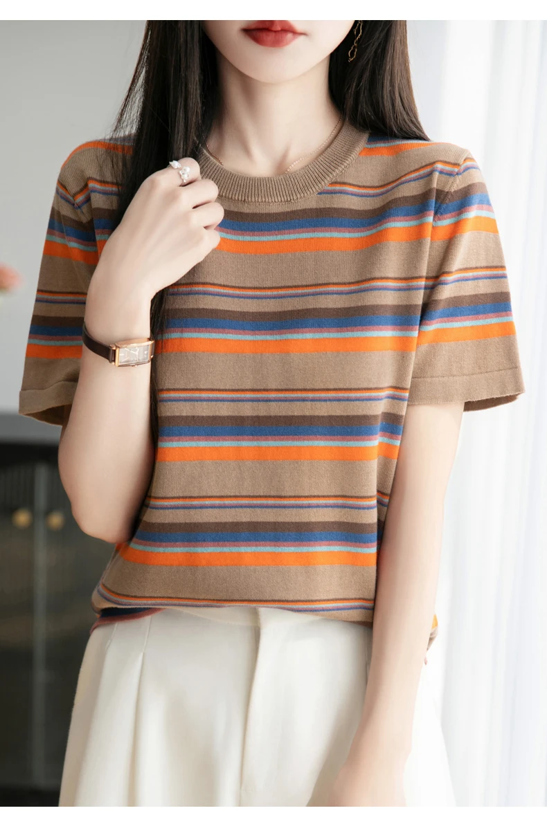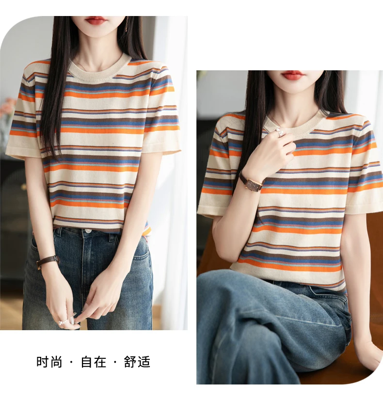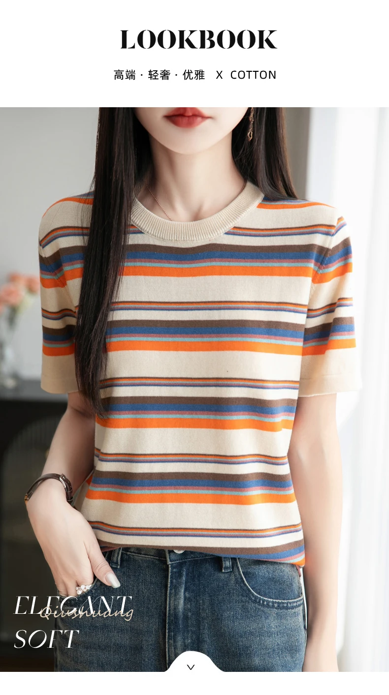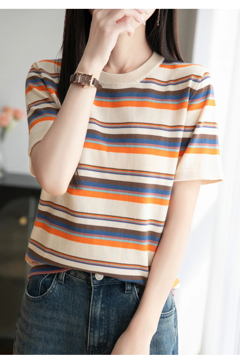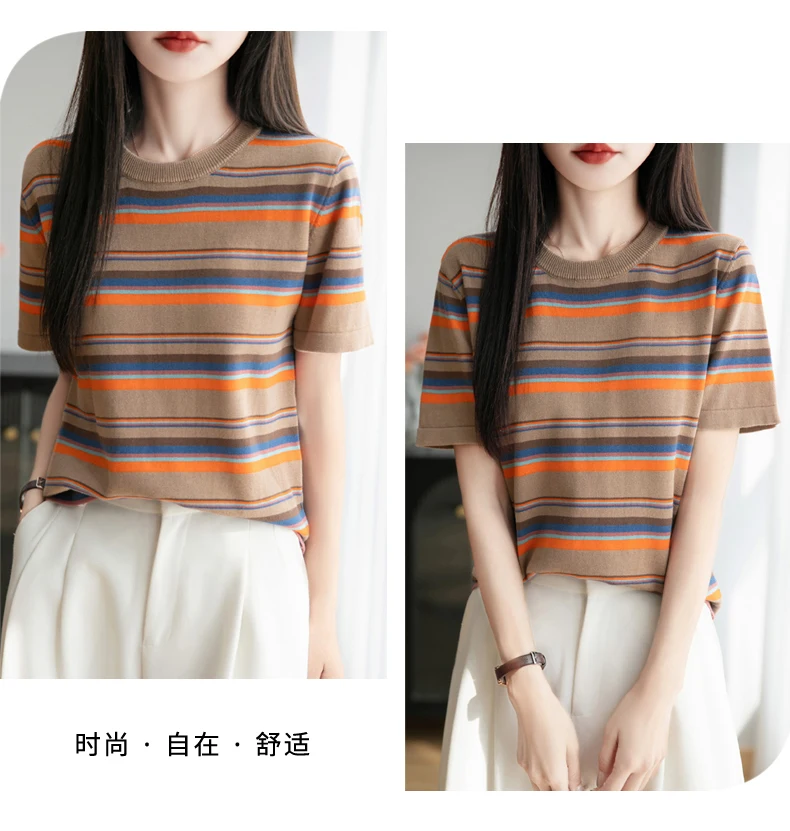 Women's summer new 100% pure cotton knitted short sleeved casual striped T-shirt loose round neck top fashionable pullover