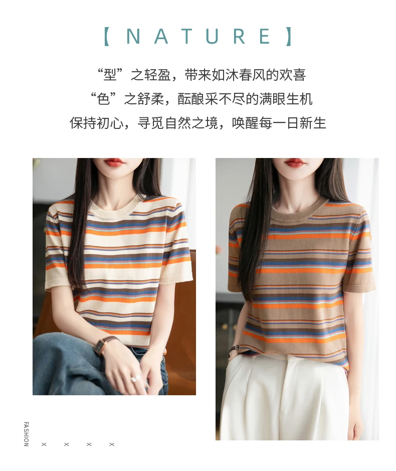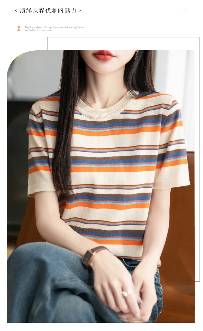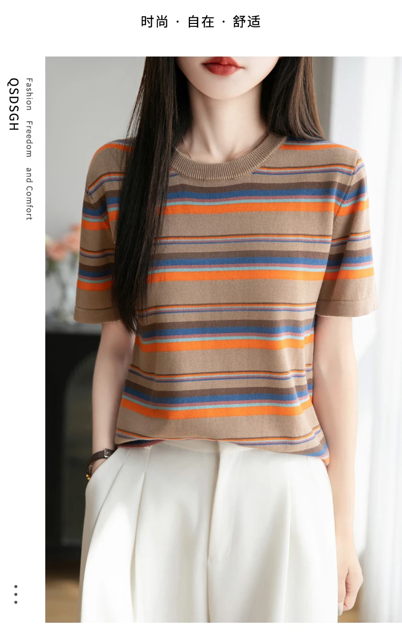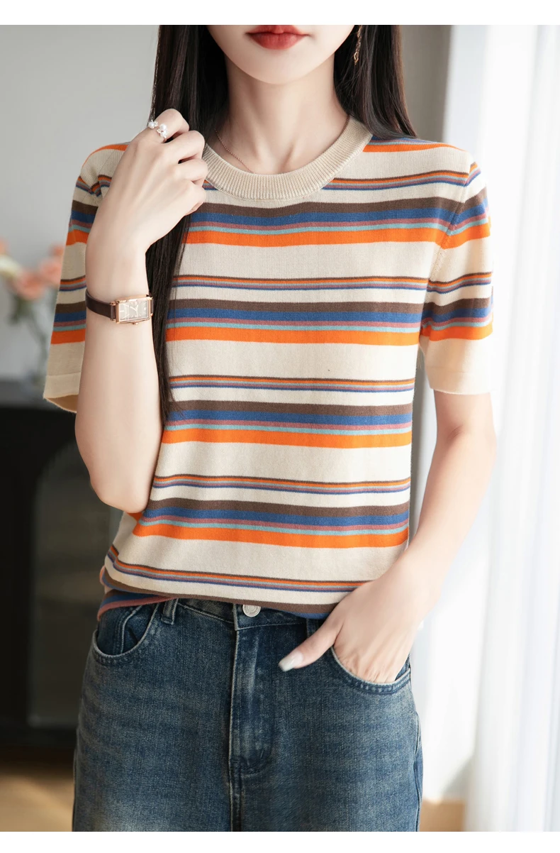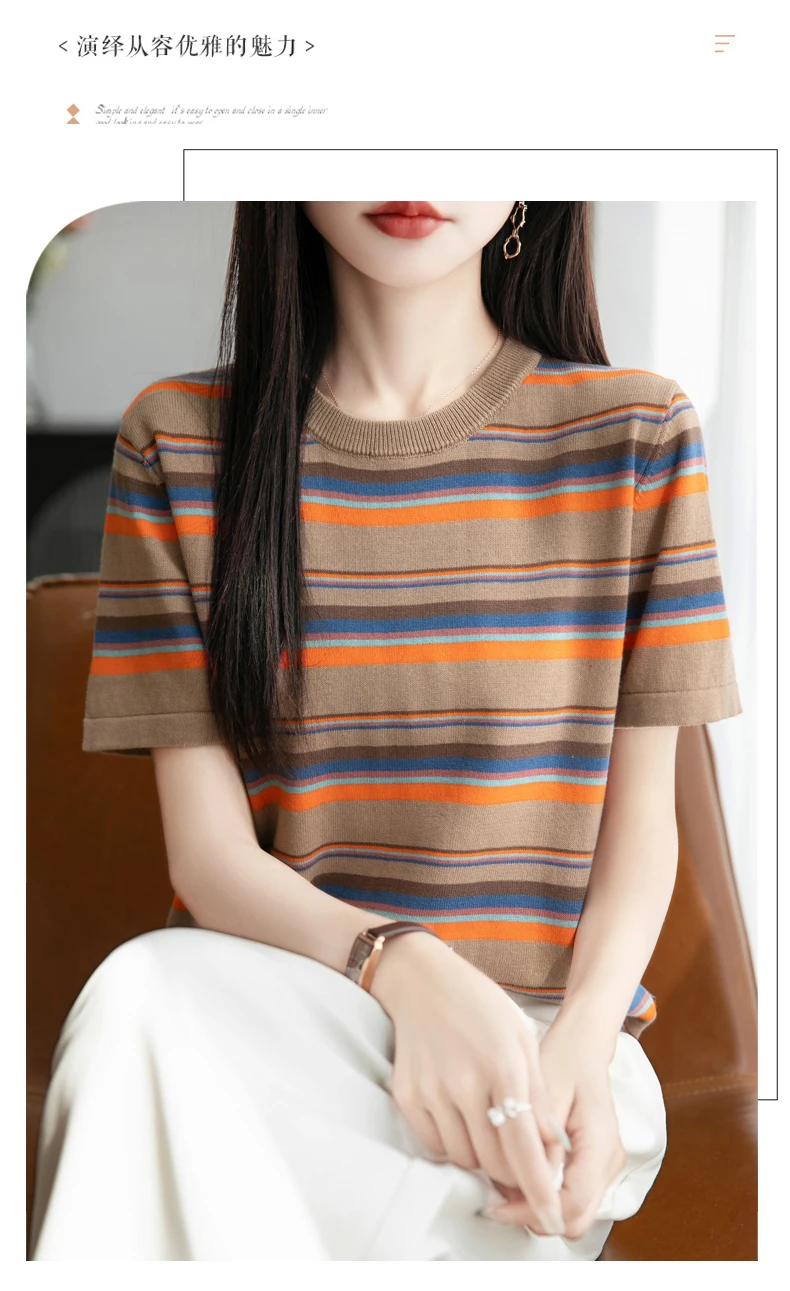 Women's summer new 100% pure cotton knitted short sleeved casual striped T-shirt loose round neck top fashionable pullover