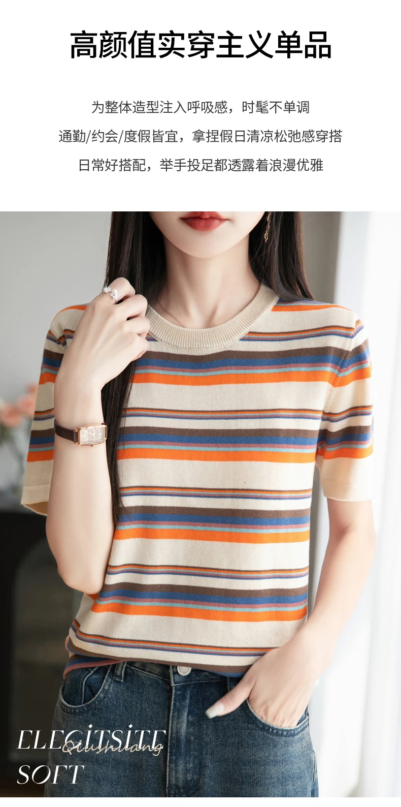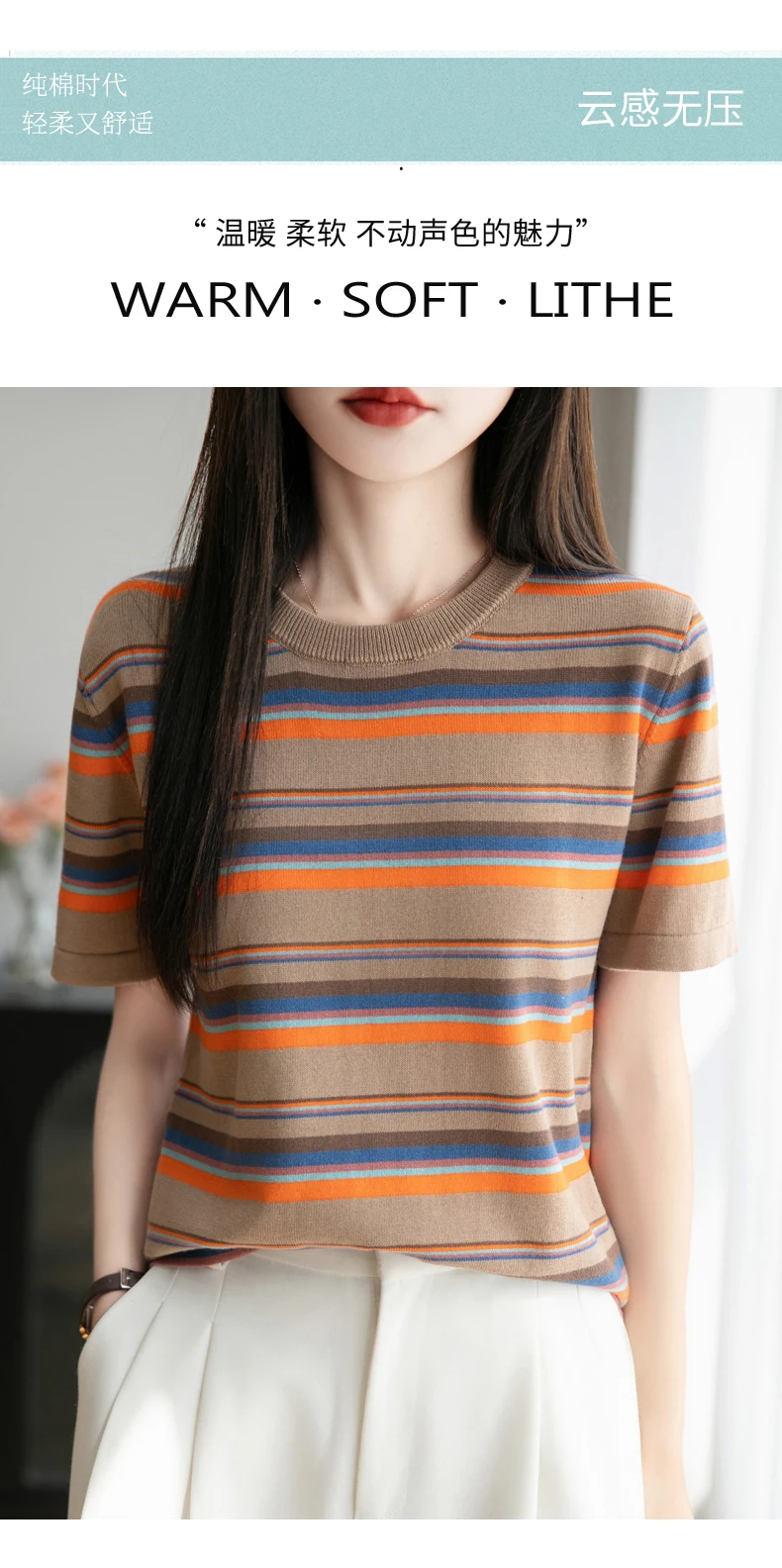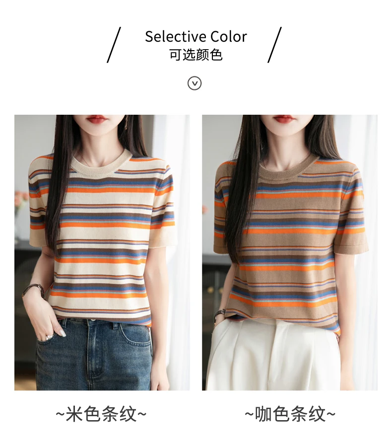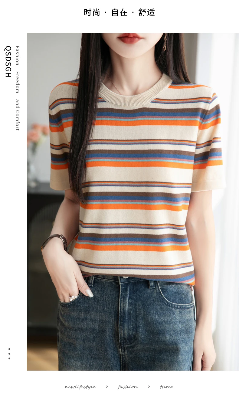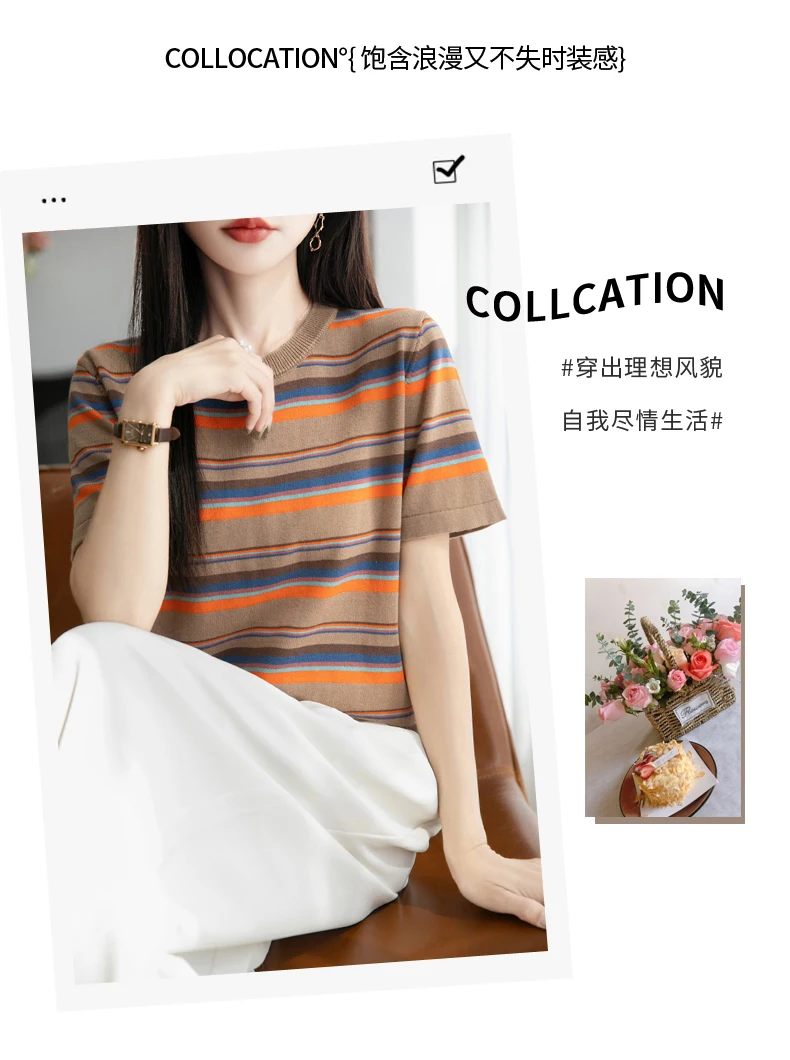 Women's summer new 100% pure cotton knitted short sleeved casual striped T-shirt loose round neck top fashionable pullover
